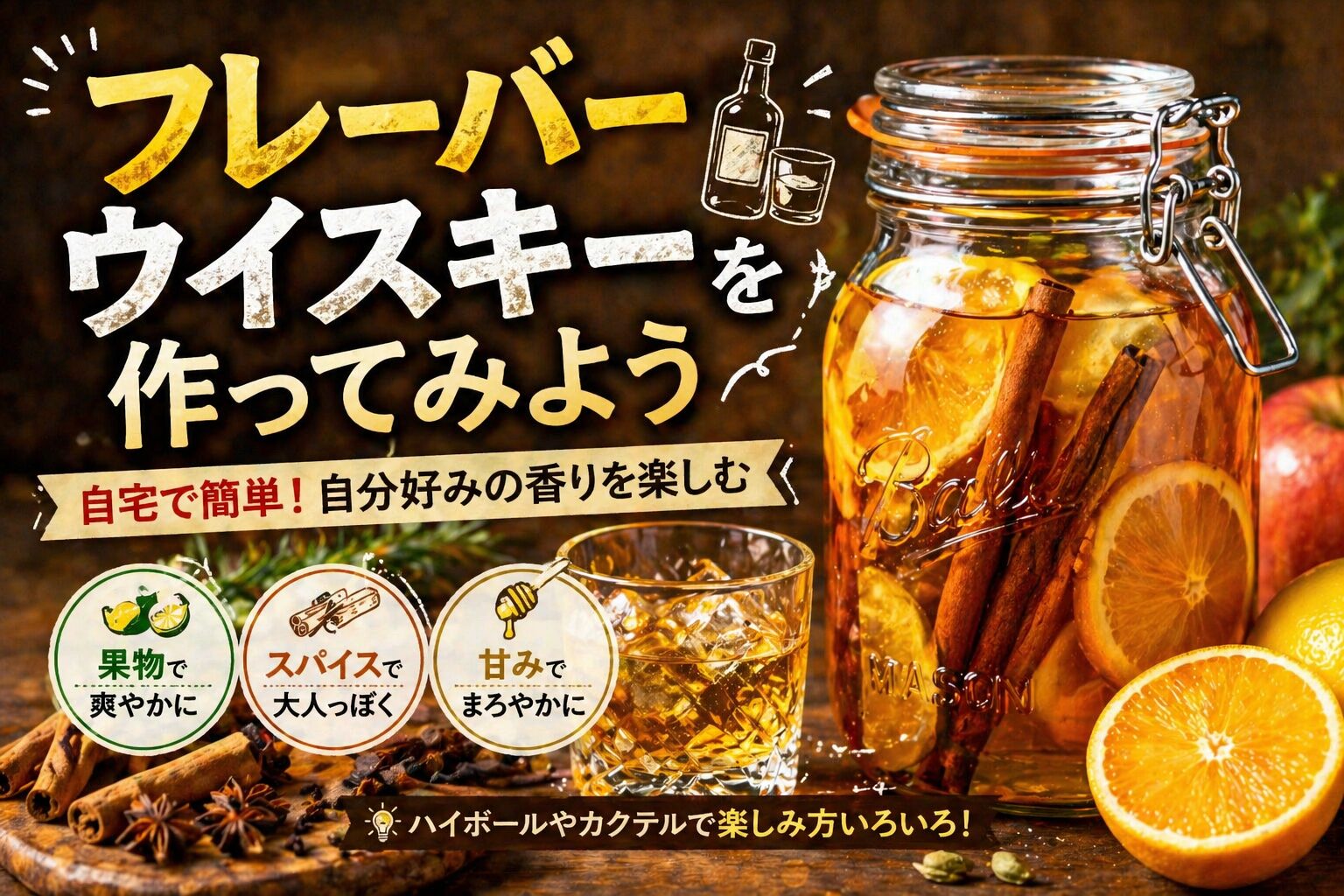 フレーバーウイスキーとは、ウイスキーに果物・スパイス・ハーブなどの香りを移して楽しむアレンジ方法です。 そのまま飲むだけでなく、ハイボールやカクテルにしても美味しく、いつもの1本を少し特別に変えてくれます。 この記事では、フレーバーウイスキーの作り方・おすすめ素材・失敗しないコツ・注意点を初心者向けにわかりやすく解説します。